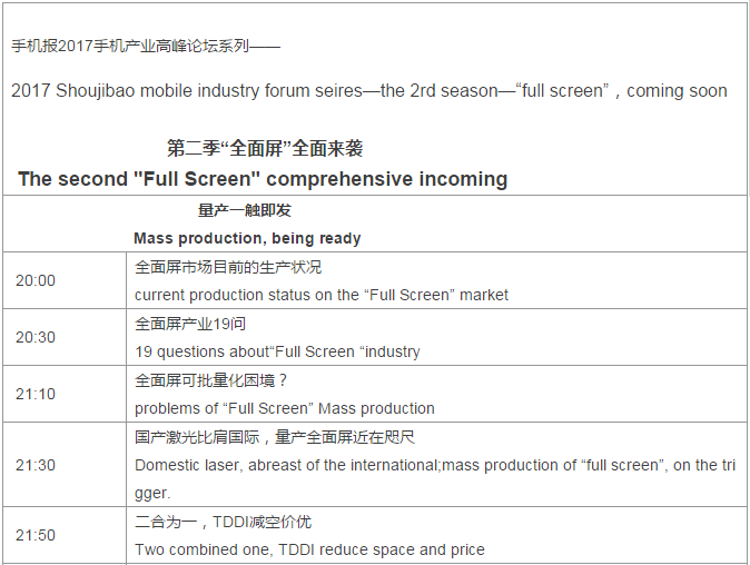 《手機(jī)報(bào)》將在9月,聯(lián)合手機(jī)產(chǎn)業(yè)的上下游企業(yè),舉辦關(guān)于第二季“全面屏”全面來襲的盛會(huì),針對(duì)全面屏的難點(diǎn)及瓶頸進(jìn)行探討;同時(shí)還將邀請(qǐng)全面屏產(chǎn)業(yè)鏈的上下游企業(yè),破解產(chǎn)業(yè)困局,共同開創(chuàng)新的時(shí)代篇章.