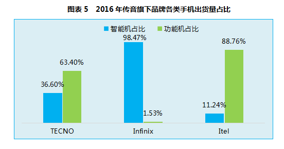 從傳音產(chǎn)品線來(lái)看,目前旗下?lián)碛蠺ECNO、itel、Infinix三大手機(jī)品牌,在全球功能機(jī)出貨量逐年下滑的情況下,傳音功能機(jī)2016年出貨量逆勢(shì)而上,增幅超過(guò)100%,其功能機(jī)出貨量為傳音上榜手機(jī)出貨量TOP5立下汗馬功勞。