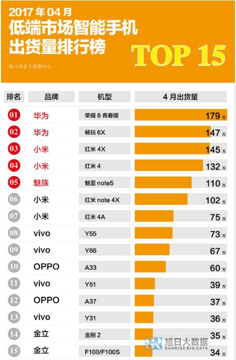為了市場能更直觀了解手機市場的競爭現(xiàn)狀,旭日大數(shù)據(jù)從2017年開始推出月度暢銷機型排行榜數(shù)據(jù),從4月份開始,更是把暢銷機型排行榜進一步拆分為高端市場、中端市場和低端市場暢銷機型排行榜。通過不同價位段的暢銷機型出貨量數(shù)據(jù),可以一目了然地看到現(xiàn)在國內(nèi)手機市場品牌之間的市場地位情況。暢銷機型排行榜自發(fā)布以來,受到了來自品牌、ODM和手機產(chǎn)業(yè)鏈企業(yè)的極大關注,而根據(jù)旭日大數(shù)據(jù)的調(diào)研團隊反饋,ODM廠商看了暢銷機型排行榜之后,很多企業(yè)老板睡不著覺了,這是為何?現(xiàn)在我們先從手機品牌方面看看排行榜中呈現(xiàn)了一種怎樣的現(xiàn)象。