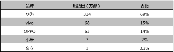 由于國內(nèi)高端智能機機型較少,因此高端市場智能手機出貨量排行榜僅統(tǒng)計了前十名機型。入榜的品牌只有華為、vivo、OPPO、小米和金立,雖然入榜的品牌達到5個,但其品牌集中度甚至高于中低端智能機市場,華為的機型占了高端暢銷機型TOP10的一半,是國內(nèi)高端機型的生產(chǎn)大戶,華為品牌的暢銷機型出貨量占據(jù)TOP10的近7成市場。而vivo和OPPO上榜的機型分別只有2款和1款,分別占據(jù)15%和14%。