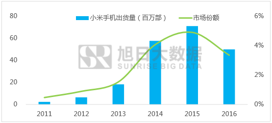 2011-2016年小米手機(jī)全球出貨量及市場(chǎng)份額