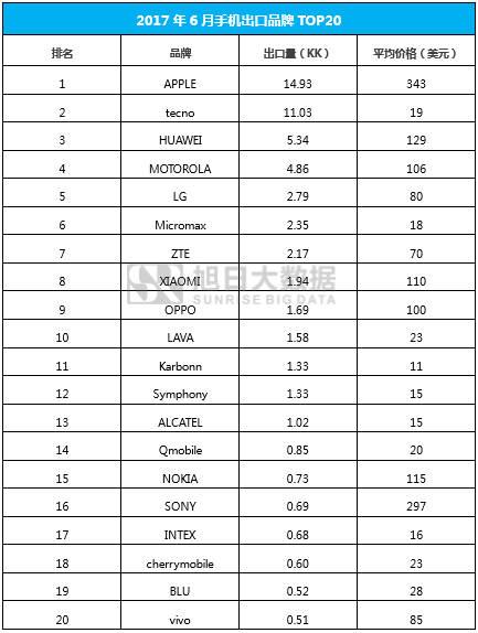 今年6月手機(jī)出口品牌TOP20中,近一半為國(guó)產(chǎn)品牌,海外品牌以