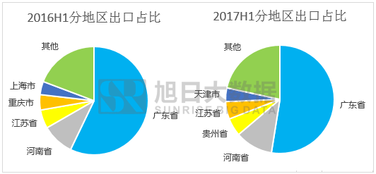 廣東省依然是中國(guó)手機(jī)出口最大的輸出中心,然而,由于珠三角地區(qū)人工、土地等成本逐漸上升,導(dǎo)致手機(jī)制造企業(yè)陸續(xù)往河南、貴州等內(nèi)陸地區(qū)轉(zhuǎn)移。2016年1-6月,有57.1%的出口手機(jī)來(lái)自于廣東省,而2017年1-6月,該份額下降到52.5%。屆時(shí),河南省從9.6%上升到11.2%,貴州則從1%上升到5.4%。