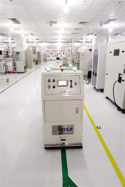 機器人小車能自動加料、送料,沿著地板上的軌跡線移動,遇到障礙物還會避開。