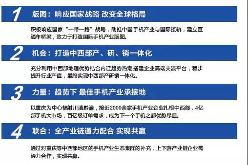 本次“重慶·國際手機(jī)產(chǎn)業(yè)文化節(jié)”主要包含重慶·國際手機(jī)產(chǎn)業(yè)暨智能裝備博覽會、國際手機(jī)產(chǎn)業(yè)高峰論壇暨年度頒獎盛典、2017全球手機(jī)新技術(shù)高峰論壇、2017重慶國際手機(jī)產(chǎn)業(yè)采購對接會、重慶市招商推介會、區(qū)縣園區(qū)投資考察參觀六項活動內(nèi)容。