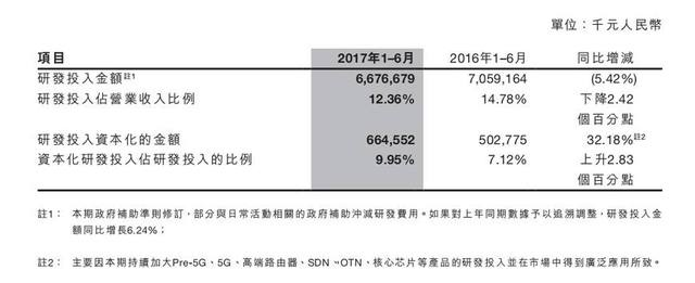2017年上半年,中興研發(fā)投入依舊高達66.77億元,占營收的比重為12.36%。