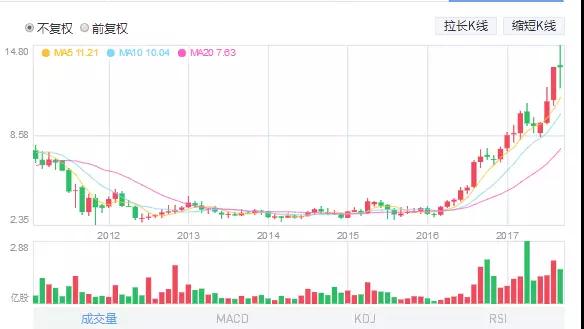 而從股價方面來看,自從去年上半年覆銅板漲價以來,建滔積層板股價更是一路飆升,由去年年初不到2元每股上漲到目前12.74元每股!從建滔積層板2010年到2017年股價走勢可以看出,從2010年10月開始到2013年均處于下降狀態(tài),從2013年到2015年底、2016年初則一直處于平穩(wěn)狀態(tài),直到2016年初覆銅板漲價開始,其股價開始一路直線飆升大漲6倍多!