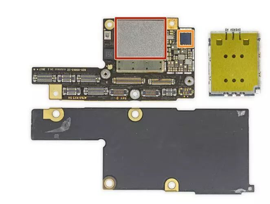 紅色:蘋果 APL1W72 A11 仿生 SoC ,海力士 3 GB LPDDR4x RAM橙色:蘋果 338S00341-B1