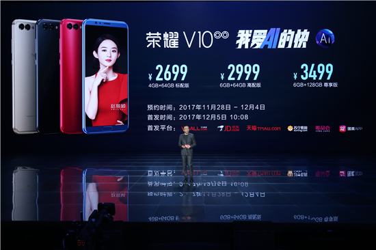 榮耀V10擁有4GB+64GB標(biāo)配版,6GB+64GB高配版和6GB+128GB尊享版三款,三個版本售價分別為2699元、2999元和3499元。即日起,該機(jī)將在華為商城(https://mm.vmall.com/ryv10.html)、京東(http://sale.jd.com/act/L1Y2V6ERZePab4.html)、天貓榮耀官方旗艦店(https://pages.tmall.com/wow/tmall-3c/17766/ryvxxpss)、蘇寧易購榮耀官方旗艦店(http://shop.suning.com/70086258/10107899.html)、唯品會榮耀官方旗艦店(https://viva.vip.com/KO6Z7X_RXhqCyjXC076MUg.html?wapid=vivap_6742)和國美榮耀官方旗艦店(http://prom.gome.com.cn/html/prodhtml/topics/201707/17/9309839330.html)6大平臺開啟預(yù)約,并將于12月5日10:08,在以上6大平臺首發(fā)。