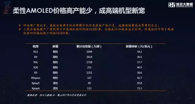 而在產(chǎn)業(yè)鏈方面,李春麗則認(rèn)為,柔性AMOLED價格高產(chǎn)能少,會成高端機(jī)型新寵。柔性AMOLED在異形切割方面難度小,速度快,良率高,因此柔性AMOLED在全面屏方面有天生的優(yōu)勢。而國產(chǎn)品牌廠商面臨著兩個難題:一個是柔性AMOLED產(chǎn)能不足,目前OPPO和vivo是三星AMOLED屏的主要使用者,但只有vivo的xplay系列有用到柔性的AMOLED屏,而且從這兩代手機(jī)的出貨量來看,其量也不大。另一個問題是價格高,根據(jù)旭日大數(shù)據(jù)的監(jiān)測,OPPO和vivo用于中高端機(jī)型上的剛性AMOLED屏價格在34到43美金之間,但柔性AMOLED的價格比剛性的價格要翻番。Xplay5的柔性AMOLED平均價格高達(dá)93美金,雖然xplay6的有所下降,但依然高達(dá)72美金。加上異形切割的成本,因此她認(rèn)為柔性AMOLED的全面屏手機(jī)將會是明年高端機(jī)型的新寵。