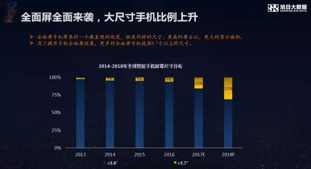 同時,她認(rèn)為全面屏?xí)苿哟蟪叽缡謾C(jī)比例上升,以及更多的差異化方案出現(xiàn)。根據(jù)旭日大數(shù)據(jù)的統(tǒng)計和預(yù)測,受益于全面屏手機(jī)的推動,5.7寸以上的手機(jī)比例將由2017年的16%左右快速上升至2018年的31%。未來在機(jī)型方面,據(jù)旭日大數(shù)據(jù)的調(diào)研,18年上半年,會有剛性面板的異形切割的形態(tài),規(guī)格也不僅限于18:9。而到18年下半年,國產(chǎn)全面屏手機(jī)將會全面開花,中端、中高端及高端市場都會有相關(guān)機(jī)型面世,產(chǎn)品形態(tài)除了有縮小額頭和下巴的,還會有配備柔性AMOLED的異形切割,產(chǎn)品規(guī)格也會進(jìn)一步豐富,甚至到19:9、19.5:9等。