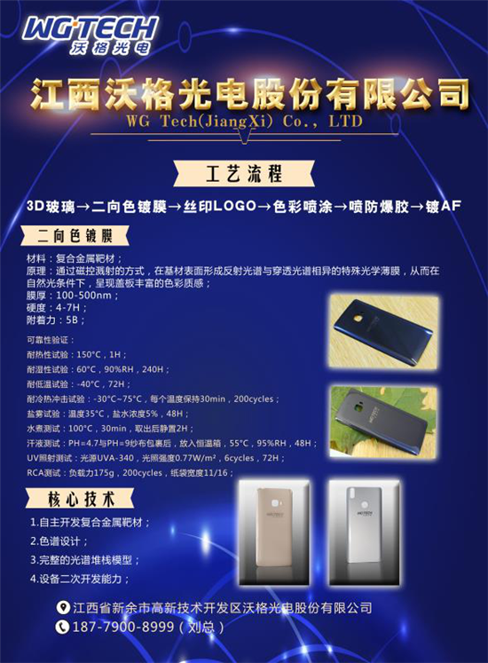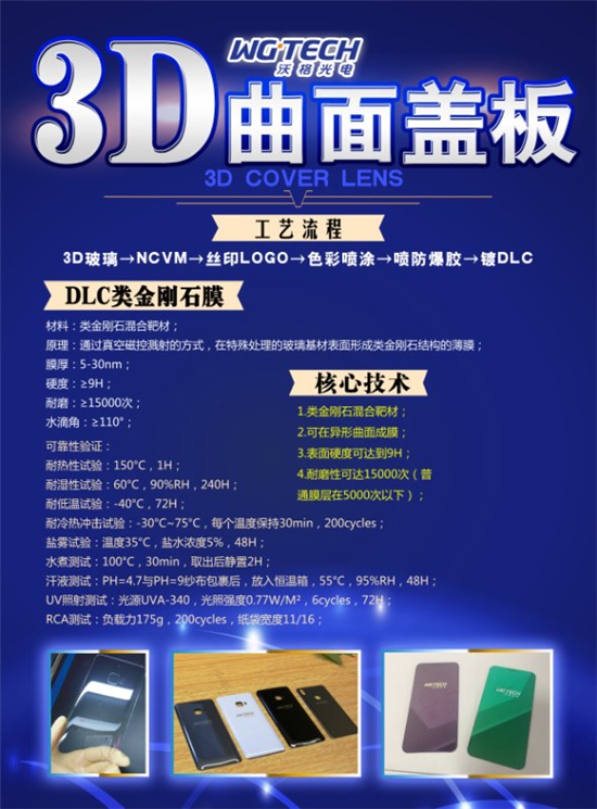 沃格光電本次重點(diǎn)展出的3D曲面玻璃,所采用的技術(shù)是沃格光電根據智能手機未來(lái)將要面對的核心應用場(chǎng)景:5G、無(wú)線(xiàn)充電、藝術(shù)品味等,自主開(kāi)發(fā)出來(lái)的創(chuàng )新技術(shù)與工藝,主要包括兩大核心技術(shù):針對用戶(hù)藝術(shù)品味提升的二向色鍍膜技術(shù),和攻克5G、無(wú)線(xiàn)充電應用所需的DLC類(lèi)金剛石膜技術(shù)。