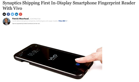 在一則福布斯Forbes的新聞報道中,正式公布Synaptics與vivo聯(lián)手推出首款屏幕指紋傳感器。并且在報道中唯一一張圖片就是實現(xiàn)了屏幕指紋識別的vivo新機,意味著vivo將會首發(fā)這一技術(shù)。