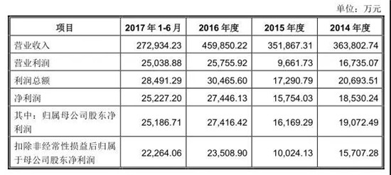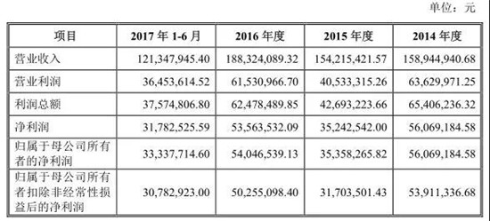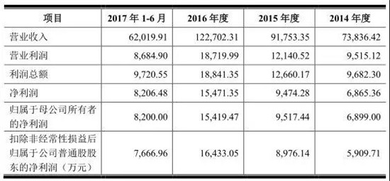 從過去幾年營收來看,從2014年到2017年上半年,其營收分別為7.38億、9.17億、12.27億、6.20億,相對應的凈利潤分別為0.68億、0.94億、1.54億、0.82億!