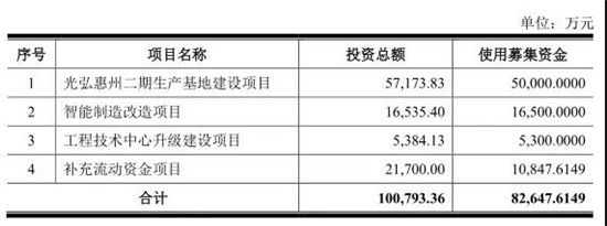 此次光弘科技發(fā)行人民幣普通股8868萬股,每股發(fā)行價9.99元,募集資金8.86億元,募集資金凈額8.28億元將用于投資光弘惠州二期生產(chǎn)基地建設、智能制造改造、工程技術中心升級建設、補充流動資金等項目。