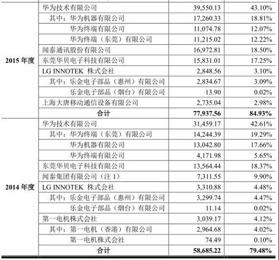 其中華為訂單占比較大,2014年-2017年上半年占比分別為16.50%、20.18%、29.09%和 24.55%!