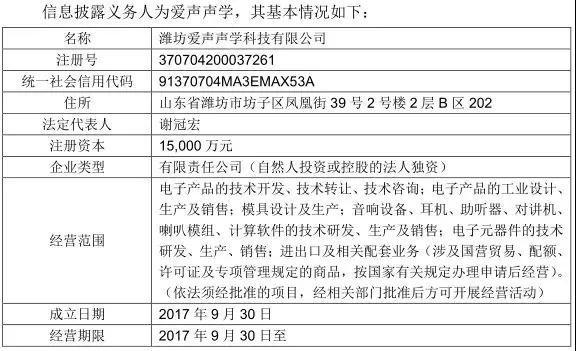 12月29日晚間,共達(dá)電聲再度公布交易方愛(ài)聲聲學(xué)信息,資料顯示,愛(ài)聲聲學(xué)成立于2017年9月30日,注冊(cè)資金為1.5億元,法定代表人為謝冠宏,公司主要從事聲學(xué)器件研發(fā)和生產(chǎn)!