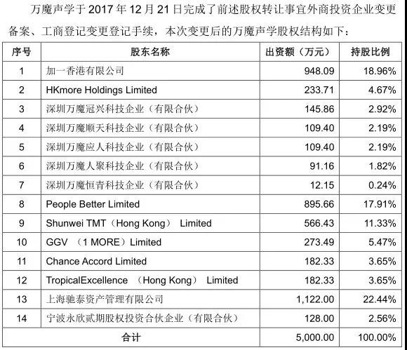 值得注意的是,愛(ài)聲聲學(xué)實(shí)際上就是萬(wàn)魔聲學(xué)旗下100%控股子公司!而萬(wàn)魔聲學(xué)的前身為加一聯(lián)創(chuàng)電子科技有限公司。加一聯(lián)創(chuàng)為加一香港于2013年10月設(shè)立的外商獨(dú)資企業(yè),注冊(cè)資本為5000 萬(wàn)元,加一香港持有加一聯(lián)創(chuàng) 100%股權(quán)。2015 年 11 月,加一聯(lián)創(chuàng)企業(yè)名稱(chēng)變更為“萬(wàn)魔聲學(xué)科技有限公司”。