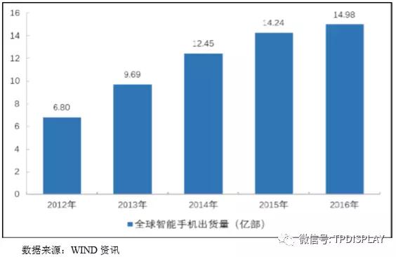 根據WIND資訊和GartnerGroup統計數據,2016年全球智能手機出貨量為14.98億部,2012-2016年復合增長(cháng)率約為21.83%4。2013年開(kāi)始,全球手機市場(chǎng)呈現突破式發(fā)展,智能手機逐漸取代傳統手機成為人們主流的日常電子消費品,智能手機增量實(shí)現近半數增長(cháng)。隨著(zhù)包括歐美發(fā)達國家、中國大陸等地區的手機保有量增速日近飽和,2014年開(kāi)始智能手機市場(chǎng)需求增速逐漸減緩。2012-2016年,全球智能手機出貨量情況如下圖所示: