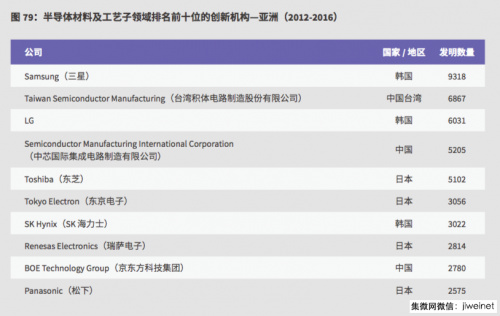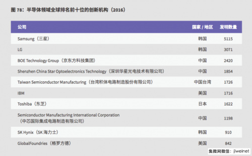 而從報告中公布的“ 2016 年半導體領(lǐng)域全球排名前十位的創(chuàng )新機構”來(lái)看,韓國廠(chǎng)商三星和 LG 分別以 5115 和 3071 件發(fā)明數量占據一、二位,引領(lǐng)全球半導體創(chuàng )新市場(chǎng)。值得注意的是,其余全球排名前十位的八家創(chuàng )新機構中有四家來(lái)自中國,包括京東方、深圳華星光電、中芯國際集成電路制造(上海)有限公司,以及中國臺灣的臺積電(TSMC)。剩下四家則分別是日本的東芝、韓國的 SK 海力士、美國的 IBM 和格羅方德(GlobalFoundries)。