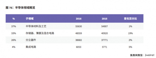 半導體主要分為半導體材料及工藝、存儲器、薄膜及混合電路、集成電路、分立器件這四個(gè)子領(lǐng)域,而從這四個(gè)子領(lǐng)域 2016 年的創(chuàng )新活動(dòng)來(lái)看,“存儲器、薄膜及混合電路”的增幅最大,達到了 19%;其次是“集成電路”,增幅達到 5%;而“分立器件”和“半導體材料及工藝”的增幅分別是 2% 和 1%。