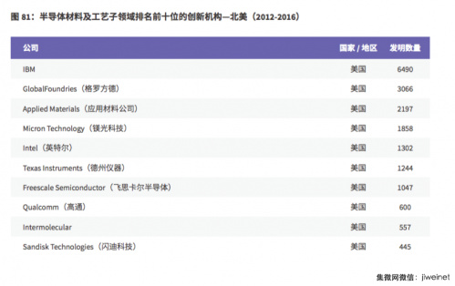 而半導體材料及工藝子領(lǐng)域北美榜的榜首歸屬 IBM,其在 2012 到 2016 年的發(fā)明數量為 6490 件,是排名第二的格羅方德( 3066 件)的兩倍。剩下的八家機構也全部來(lái)自美國,其中英特爾、高通、閃迪科技分別以 1302 件、600 件、445 件發(fā)明數量位居第五、八、十位。