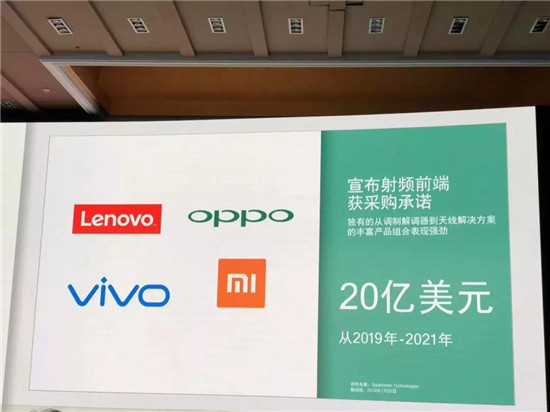 2017年11月,高通與OPPO、vivo、小米簽訂120億美元的高額訂單(三年內(nèi)),2018年1月25日,高通再次與OPPO、vivo、小米、聯(lián)想簽訂20億美元的高額訂單,主要采購(gòu)產(chǎn)品為射頻前端,并且不在120億美元的訂單內(nèi)!
