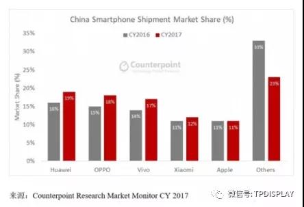 市場(chǎng)調(diào)研機(jī)構(gòu)Counterpoint數(shù)據(jù)顯示,在2017年中國(guó)智能手機(jī)市場(chǎng),