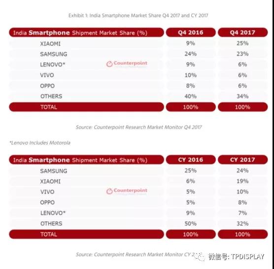 印度也實(shí)現(xiàn)了大幅增長(zhǎng)。Counterpoint數(shù)據(jù)顯示,在2017年第四季度,小米在印度智能手機(jī)市場(chǎng)的占有率達(dá)到25%,首次正式超越