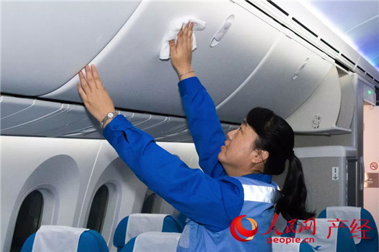 除了更換椅套之外,客艙保障員還要對客艙進(jìn)行清潔打掃,如清潔廚房、擦拭小桌板、行李架、盥洗室、壁板及PMD配備等日常工作,并根據(jù)飛機(jī)的運行周期定期對客艙內(nèi)進(jìn)行“深度清潔”,不放過任何縫隙,清潔無死角。