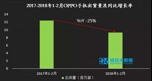 據(jù)旭日大數(shù)據(jù)統(tǒng)計,2017年OPPO智能手機出貨量達到1.16億部,占據(jù)全球排行榜第4位,同比增幅超10%。國內(nèi)3、4線城市的換機潮后,OPPO增幅明顯開始放緩,隨著全球及國內(nèi)市場平臺期的到來,OPPO在2018年開年表現(xiàn)出明顯的頹勢,1-2月出貨量約9.26KK,同比下滑25%。