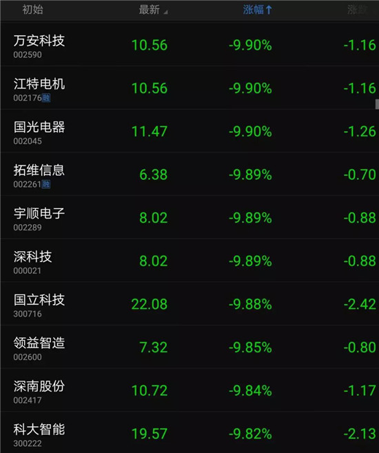 據(jù)手機報在線統(tǒng)計,其中建滔積層板下跌15.45%,紫光控股下跌10.48%、建滔化工下跌10.16%,星星科技下跌10.04%,萊寶高科下跌10.04%、卓翼科技下跌10.02%、雅克科技下跌10.01%、士蘭微下跌10.01%、同興達下跌10.00%、東尼電子下跌10.00%、盈趣科技下跌10.00%、深南電路下跌10.00%、廣和通下跌10.00%、聯(lián)得裝備下跌10.00%、三六零下跌10.00%、環(huán)宇數(shù)控下跌10.00%、大富科技下跌10.00%、長盈精密下跌10.00%、信維通信下跌10.00%、安潔科技下跌10.00%···
