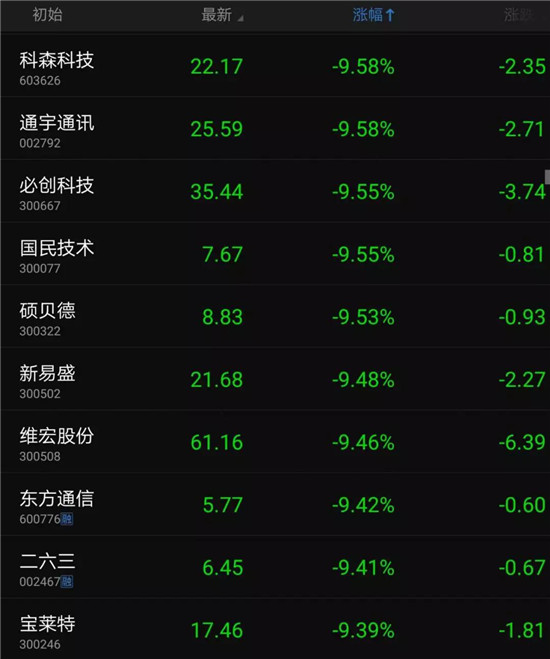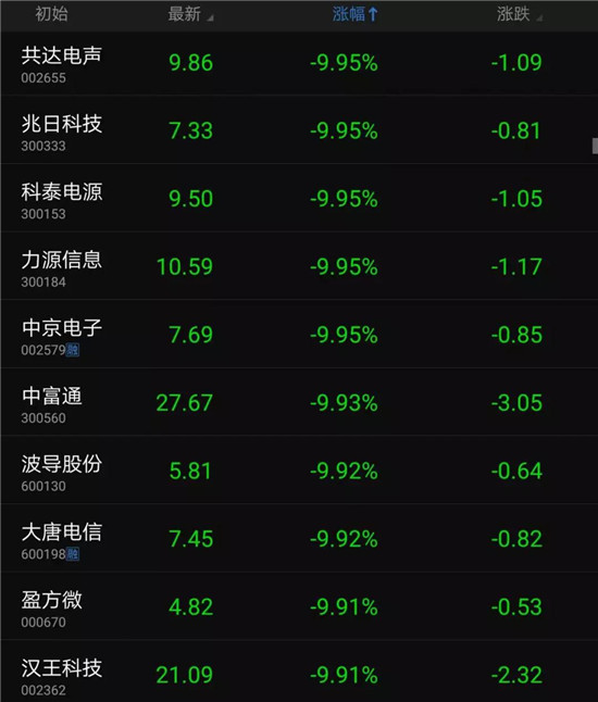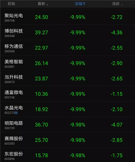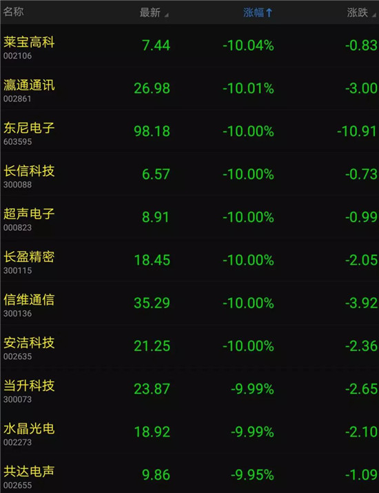 普路通下跌9.99%、通富微電下跌9.99%、水晶光電下跌9.99%、光弘科技下跌9.99%、春秋電子下跌9.99%、美格智能下跌9.99%、賽摩電氣下跌9.97%、中京電子下跌9.95%、共達電聲下跌9.95%、波導股份下跌9.92%、大唐電信下跌9.92%、蘇州固礙下跌9.91%、宇順電子下跌9.89%、領益智能下跌9.85%、科森科技下跌9.58%、國民技術下跌9.55%、碩貝德下跌9.53%、先鋒新材下跌9.32%、國瓷材料下跌9.21%···