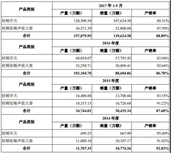 從售價方面來看,2014年度、2015年度、2016年度和2017年1-9月,本公司主要產品射頻開關平均單價分別為0.2595元/顆、0.4089元/顆、0.4619元/顆和0.3494元/顆;射頻低噪聲放大器的平均單價分別為0.2967元/顆、0.2519元/顆、0.3474元/顆和0.2915元/顆。