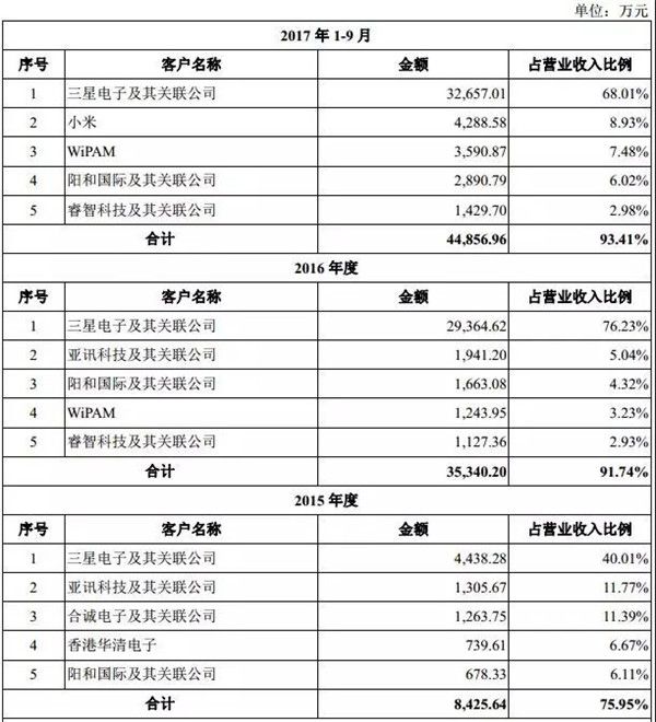 而從客戶群體來看的話,報告期內三星作為卓勝微電子第一大客戶,2014年度、2015年度、2016年度和2017年1-9月份貢獻了公司整體收入的31.25%、40.01%、76.23%和68.01%。由此可見,其對三星的業(yè)務依賴相當之重!其射頻前端芯片產品應用于三星(直銷)、小米(直銷)、華為、聯(lián)想、魅族、TCL等終端廠商的產品。