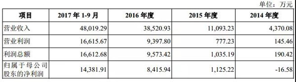 從其營收角度來看,2014年度、2015年度、2016年度和2017年1-9月其營收分別為0.43億元、1.10億元、3.85億元、4.80億元,相對應的凈利潤則分別為-16.58萬元、1125.22萬元、8415.94萬元、1.43億元,2015 年度、2016年度的收入增速分別為153.85%、247.25%!顯然可見,其2014年仍處于虧損狀態(tài),但截至2017年,其凈利潤已經過億,增長之快令人乍舌!