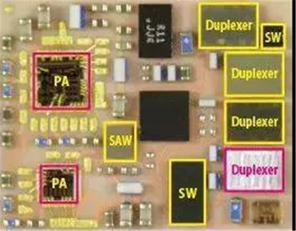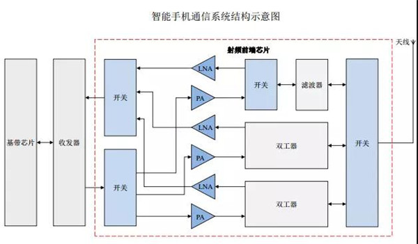 眾所周知,射頻前端芯片包括射頻開關、射頻低噪聲放大器、射頻功率放大器、雙工器、射頻濾波器等芯片。射頻開關用于實現(xiàn)射頻信號接收與發(fā)射的切換、不同頻段間的切換;射頻低噪聲放大器用于實現(xiàn)接收通道的射頻信號放大;射頻功率放大器用于實現(xiàn)發(fā)射通道的射頻信號放大;射頻濾波器用于保留特定頻段內的信號,而將特定頻段外的信號濾除;雙工器用于將發(fā)射和接收信號的隔離,保證接收和發(fā)射在共用同一天線的情況下能正常工作。