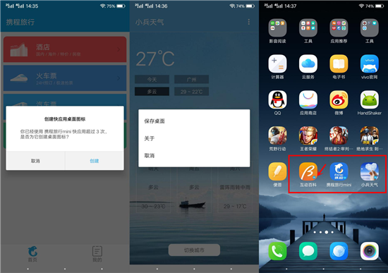 此外,快應用同樣跟傳統(tǒng)應用一樣,可以在桌面創(chuàng)建圖標。當你使用該快應用超過3次之后,在返回退出時,就會提醒你創(chuàng)建桌面圖標,或者點擊應用的右上角進行主動添加快應用到桌面??鞈玫膱D標在傳統(tǒng)圖標的基礎(chǔ)上加入了一個小標識,表明其獨特的身份。
