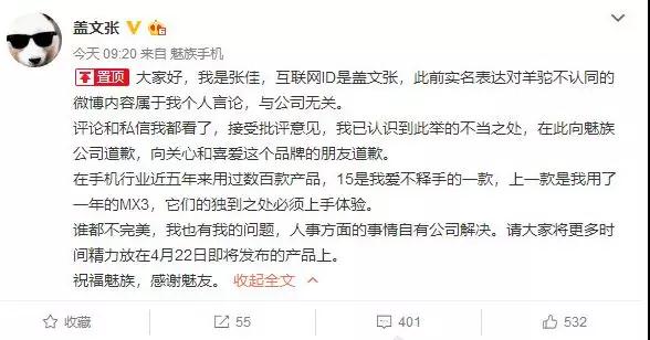 不過(guò),隨后蓋文章的微博中已經(jīng)刪除了上述內容,并在微博中發(fā)表了一條致歉信息,表示認識到此舉的不當之處,在此向魅族公司道歉,向關(guān)心和喜愛(ài)這個(gè)品牌的朋友道歉,人事方面的事情自有公司解決。