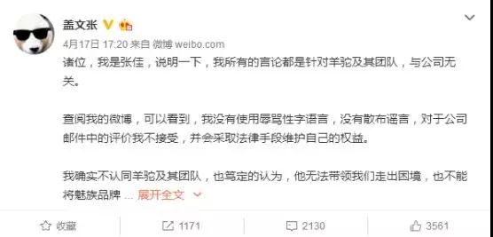 此外,張佳在微博中還發(fā)布表示:諸位,我是張佳,說(shuō)明一下,我所有的言論都是針對羊駝及其團隊,與公司無(wú)關(guān)。查閱我的微博,可以看到,我沒(méi)有使用辱罵性字語(yǔ)言,沒(méi)有散布謠言,對于公司郵件中的評價(jià)我不接受,并會(huì )采取法律手段維護自己的權益。我確實(shí)不認同羊駝及其團隊,也篤定的認為,他無(wú)法帶領(lǐng)我們走出困境,也不能將魅族品牌推向所謂的中高端定位。