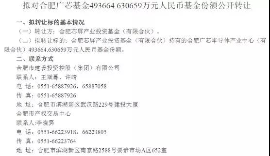 據了解,早在2018年3月2日,安徽合肥公共資源交易中心發(fā)布公告稱(chēng),擬對合肥廣芯基金493664.630659萬(wàn)元人民幣(約50億元)基金份額公開(kāi)轉讓。
