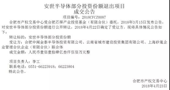 到了4月23日,據合肥市產(chǎn)權交易中心再次發(fā)布公告表示,受合肥芯屏產(chǎn)業(yè)投資基金(有限合伙)委托,2018年3月15日發(fā)布公告,對安世半導體部分投資份額進(jìn)行公開(kāi)轉讓?zhuān)?018年4月22日確定了受讓方。受讓方為合肥中聞金泰半導體投資有限公司、云南省城市建設投資集團有限公司、上海硅胤企業(yè)管理合伙企業(yè)(有限合伙)聯(lián)合體,成交金額為114.35億元!