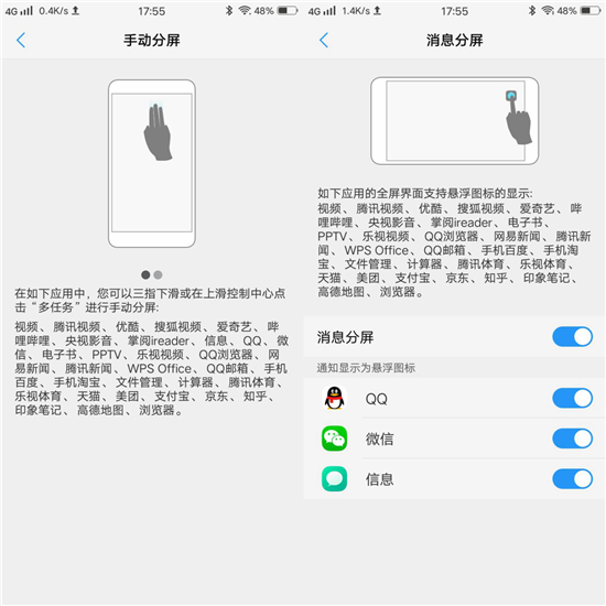 雖然這個功能早很多機(jī)型上都出現(xiàn)過,但是vivoY71做的卻非常貼心好用,在開啟功能上只需三指下滑,便可以啟動分屏模式,從此我們可以一邊看電影一邊回復(fù)消息,一邊玩游戲一邊發(fā)短信。