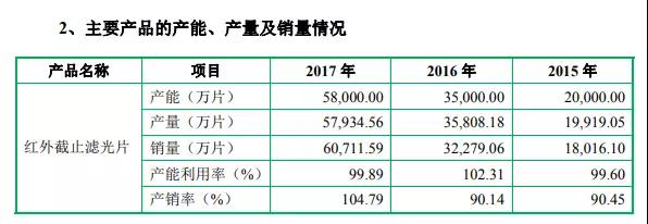 與此同時,其紅外濾光片的產(chǎn)能在2017年也出現(xiàn)了大幅提升。通過上表可以看出,這三年時間里,其產(chǎn)能利用率幾乎達到100%。