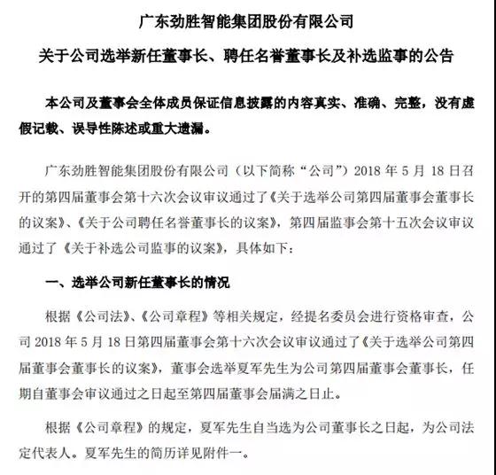 隨后,其發(fā)布《關(guān)于公司選舉新任董事長(cháng)、聘任名譽(yù)董事長(cháng)及補選監事的公告》,公告內容表示,選舉創(chuàng )世紀董事長(cháng)夏軍為勁勝智能董事長(cháng),聘任王九全為勁勝智能名譽(yù)董事長(cháng),選舉王瓊為勁勝智能第四屆監事!