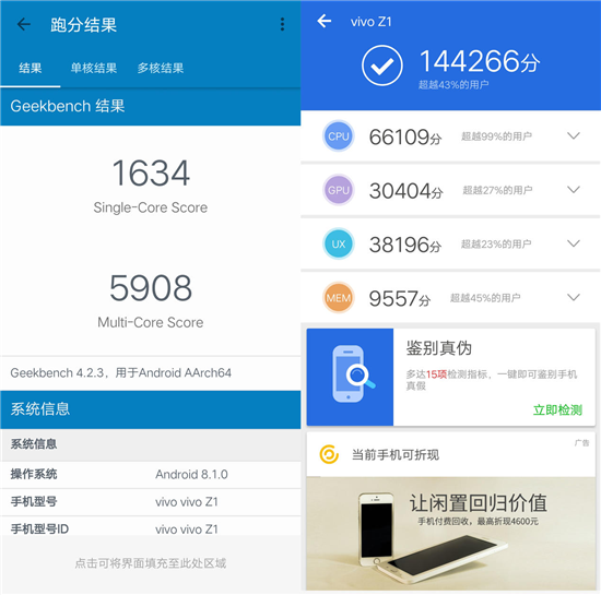 通過GeekBench的跑分,我們看到,vivo Z1的單核跑分為1634分,多核跑分為5908分。這一分?jǐn)?shù)在眾多驍龍660 AIE機型中也是屬于最頂尖的級別。同時,vivo Z1在安兔兔的跑分為14萬+,CPU跑分超過99%的用戶。由此可見,vivo Z1在性能上的表現(xiàn)是無需擔(dān)憂的。