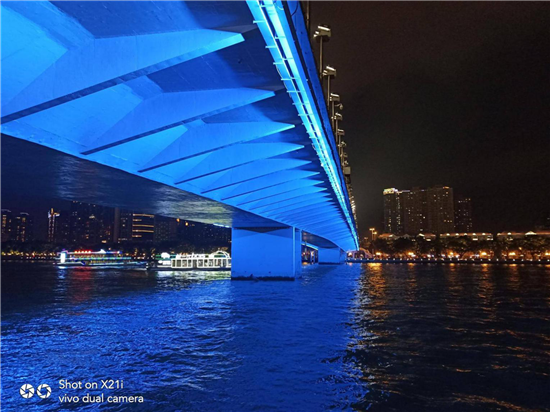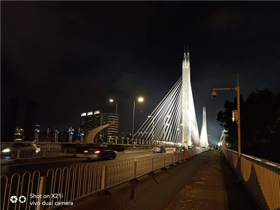面對夜間較弱的光線以及復雜的光源,vivo X21i再次發(fā)揮出了F1.8的大光圈的優(yōu)勢,獲取了更多的進光量,同時得益于AI智慧場景的智能優(yōu)化,即使在光線條件極差的橋底下,vivo X21i依舊拍出了江面波光凌凌的質感細節(jié)。