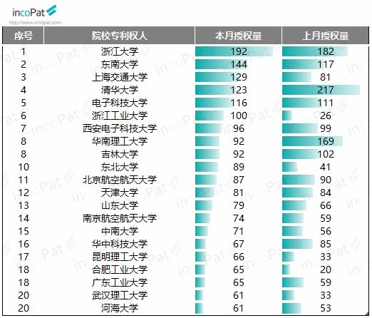 與此同時,東北大學(xué)、昆明理工大學(xué)、合肥工業(yè)大學(xué)的發(fā)明授權(quán)量都有大幅增長。而清華大學(xué)的發(fā)明授權(quán)量減少近半,由上月的第一位跌至了本月的第四位;華南理工大學(xué)的發(fā)明授權(quán)量減少明顯,由上月的第三位跌至了本月的第八位。(校對/茅茅)