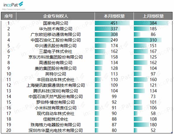 排名前二十位的企業(yè)專利權(quán)人的位次與4月相比有較大變化。其中,國家電網(wǎng)的發(fā)明授權(quán)量為451件,繼續(xù)保持第一;華為本月的發(fā)明授權(quán)量較4月翻了一番,位列第二;OPPO的發(fā)明授權(quán)量漲勢迅猛,本月的發(fā)明授權(quán)量較4月份增長了約2.5倍,排名由上月的十八位躍居至本月第三位。