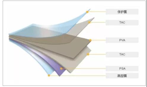偏光片由多層膜復合而成,核心膜材 PVA 負責偏振作用。偏光片由 PVA 膜,TAC膜,保護膜,離型膜和壓敏膠組成,其中,吸附二向吸收分子的 PVA 膜負責偏振作用,是偏光片的核心膜材,決定偏光片的偏光性能,透過(guò)率及色調等關(guān)鍵參數, TAC 膜則起到對延伸的 PVA 膜的支撐和保護。